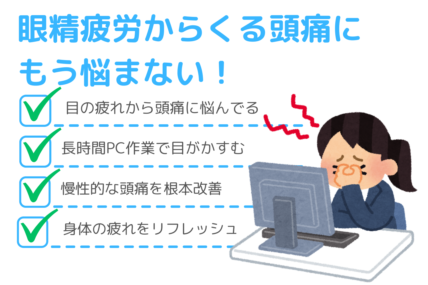 特にデスクワークなどで眼を酷使して疲れ気味の方、首肩にコリや痛みのある方、筋肉が硬くなっているように感じる方は、早めに血流を改善しなければ、眼精疲労だけではなくさまざまな点にひずみが出てしまいます。